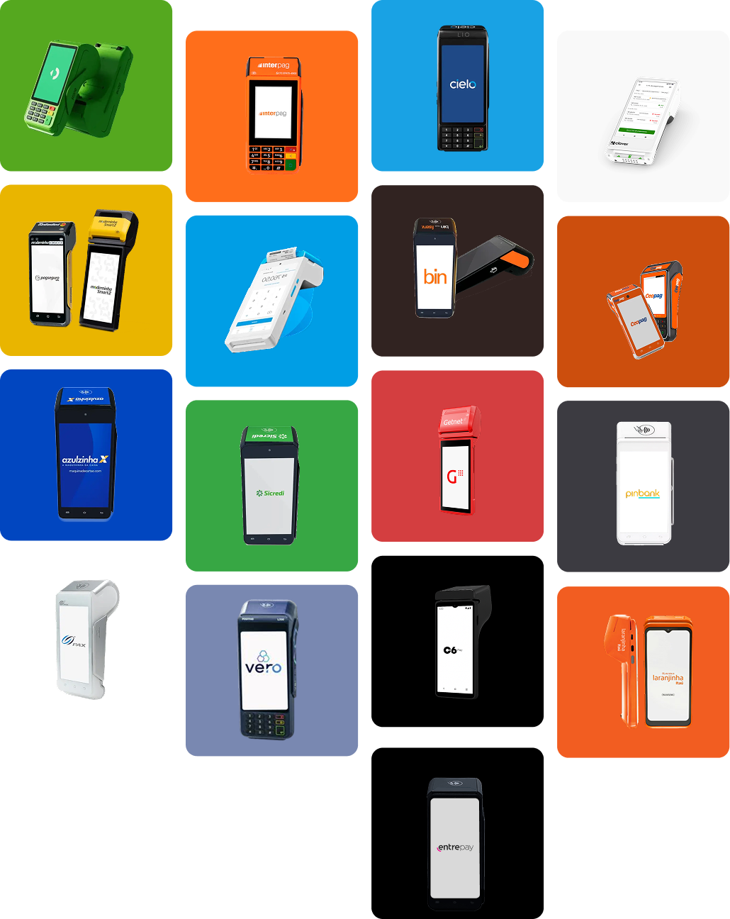 Trabalhamos com as principais adquirentes do mercado (Cielo, Rede (Itaú - Laranjinha), Stone, Getnet, PagSeguro,Sicred, Caixa, Bin, Adiq, Entrepay, CeoPag, Mercado pago, Vero, Fiserv, Pinbank, Phoebus, Clover, C6, Interpag, etc..), aceitando bandeiras como Visa, MasterCard, Elo, Amex, entre outras.